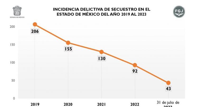 En los primeros siete meses de este año, en la entidad mexiquense se cometieron 43 delitos de secuestro, cifra que se mantiene por debajo de los 52 ilícitos registrados en ese mismo periodo durante el 2022, es decir, una disminución del 17 por ciento.