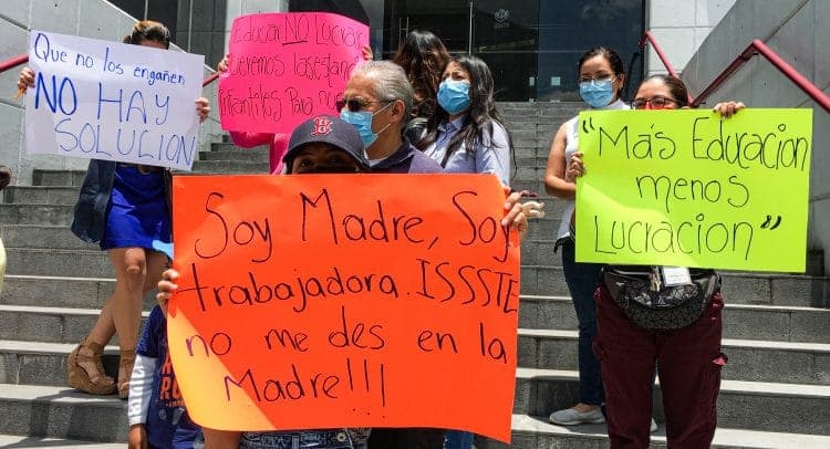 Padres de familia se manifestaron a las afueras de la Delegación Estado de México del Instituto de Seguridad y Servicios Sociales de los Trabajadores del Estado (ISSSTE) donde denunciaron el cierre de estancias infantiles en los municipios de Toluca y Tultitlán, esté cierre contemple la afectación de al menos 100 familias.