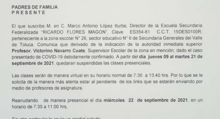 En otro caso, el director de la escuela federalizada “Ricardo Flores Magón”, Marco Antonio López, que se ubica en San Luis Mextepec, en Zinacantepec, anunció que ante la confirmación de un caso de Covid-19, a partir del jueves 9 y hasta el 21 de septiembre, quedarán suspendidas las clases presenciales y sólo se trabajará a distancia de manera virtual.