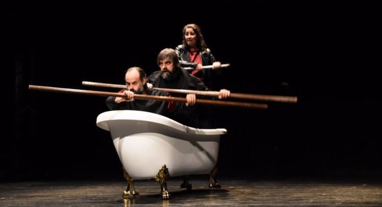 El director de “Conquistadores” ha concebido una puesta en escena minimalista, con escasos elementos materiales (una bañera victoriana, unas varas) y un espacio casi vacío, sin escenografía.