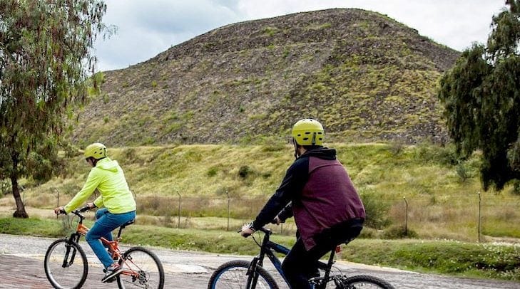 En Teotihuacán y San Martín de las Pirámides, prestadores de servicios turísticos ofrecen servicio de paseo en bicicleta en el que visitantes nacionales y extranjeros pueden recorrer los alrededores de la zona arqueológica.
