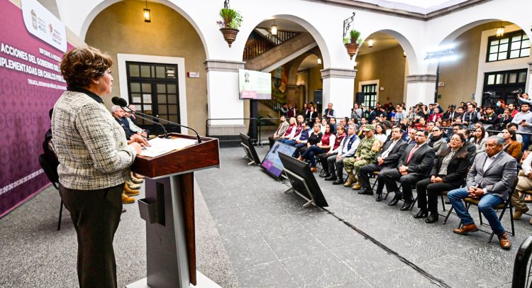 TOLUCA.- La Gobernadora del Estado de México, Delfina Gómez Álvarez realizó un informe sobre las acciones que se realizan en el municipio de Chalco para atender a las 600 familias afectadas, entre estas, destaca el despliegue de 5 mil 600 elementos y 500 vehículos, y alista obras de infraestructura para la modernización del Colector Solidaridad.