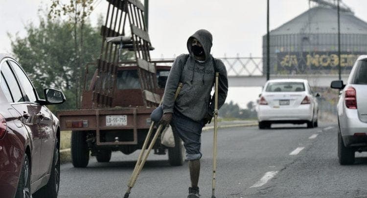 Se trata de un migrante centroamericano quien a pesar de su evidente discapacidad ha logrado llegar hasta Toluca y está decidido a continuar su camino.