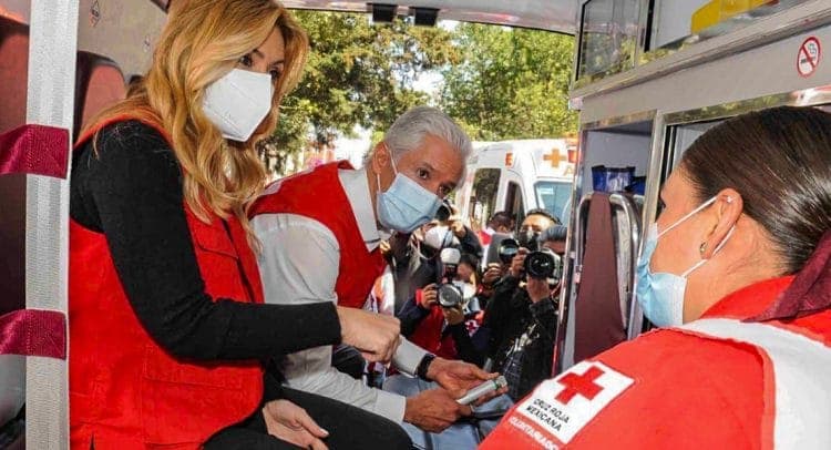 Ahí también se dio el banderazo de salida a nueve ambulancias totalmente equipadas que mejorarán la calidad de atención y el tiempo de respuesta a emergencias, y serán asignadas a delegaciones de la Cruz Roja estatal.