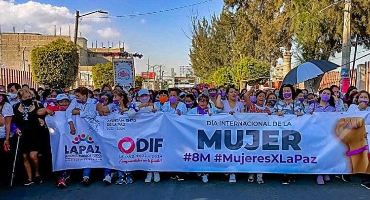 Los Reyes.-Casi cinco mil quinientas amas de casa, vecinas, mujeres que trabajan, adultos mayores y personal administrativo en La paz, edomex, realizaron la Caminata de la Sororidad, para conmemorar el Dia Internacional de la Mujer en La Paz, Edoméx.