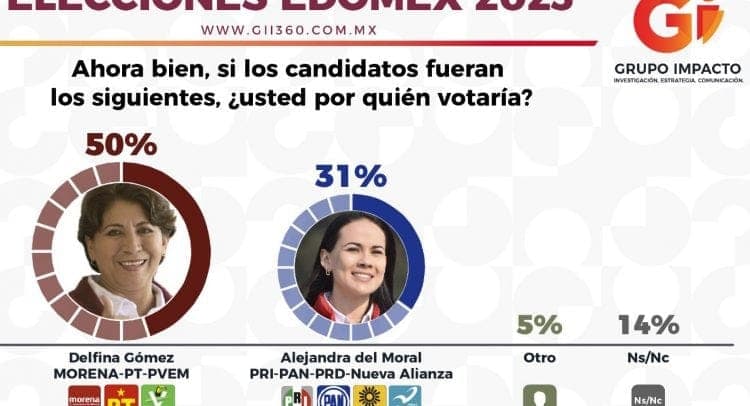 De acuerdo al estudio, el 50 por ciento de las personas encuestadas se inclinaría por la maestra Delfina Gómez, en tanto 31 por ciento lo haría por Alejandra del Moral, obteniendo así una ventaja de 19 puntos.