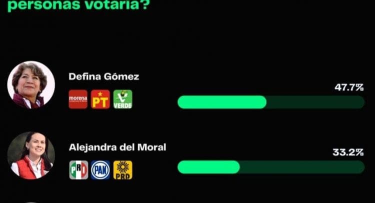 Asimismo, de acuerdo con la encuesta publicada por el diario de circulación nacional El Heraldo de México, la maestra Delfina Gómez cuenta con el 47.7 por ciento de intención del voto, en tanto Del Moral tiene un 33.2 por ciento de las preferencias, es decir, existe una diferencia de 14.5 puntos entre las contendientes.