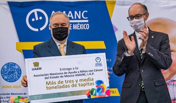 Toluca.- El rector de la Universidad Autónoma del Estado de México (UAEMéx), Carlos Eduardo Barrera Díaz, entregó a nombre de la comunidad universitaria 3.5 toneladas de taparroscas a la Asociación Mexicana de Ayuda a Niños con Cáncer del Estado de México (AMANC), I.A.P., lo que se traducirá en recursos económicos para apoyar las causas de esta institución.