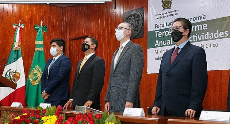 Al encabezar el Tercer Informe Anual de Actividades que rindió el director de la Facultad de Economía, Alejandro Alanís Chico, el rector de la UAEMéx reconoció a este organismo académico como un referente estatal al impartir sus cuatro licenciaturas: Economía, Negocios Internacionales Bilingüe, Actuaría y Relaciones Económicas Internacionales en sistema de enseñanza mixto y esta última, también con la opción a distancia.