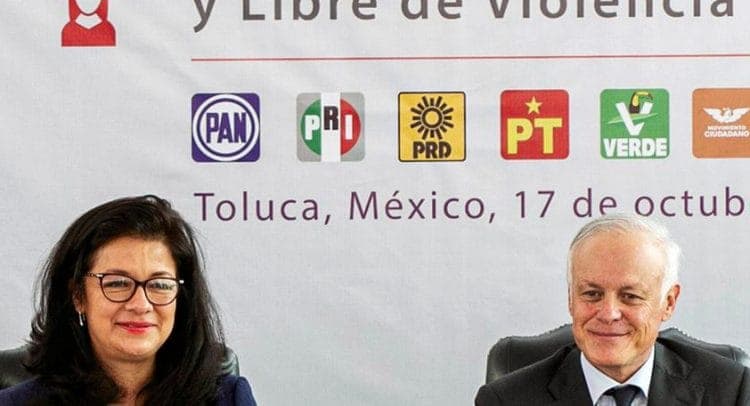 Eric Sevilla se comprometió a cumplir los 10 planteamientos del pacto estatal ante la secretaria de las Mujeres, Martha Hilda González Calderón y las titulares del Tribunal Electoral, Leticia Victoria Tavira, y del Instituto Electoral del Estado de México, Amalia Pulido Gómez.