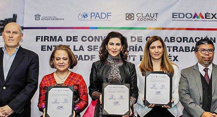 Metepec.- La Secretaria del Trabajo, Maribel Góngora Espinosa, encabezó la firma de un convenio de colaboración entre la dependencia a su cargo y la Fundación Panamericana para el Desarrollo y Clúster Automotriz, con el objetivo de realizar actividades de capacitación e involucrar a los empleadores del sector automotriz en la consolidación de la Reforma Laboral en el Estado de México.