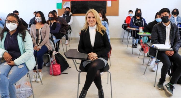 Al entregar también pants escolares, Romina Contreras indicó que, con la puesta en marcha de esta preparatoria, con una inversión de más de 14 millones de pesos, se cambiará la historia de quienes viven en Agua Blanca, El Laurel, Llano Grande y Piedra Grande.