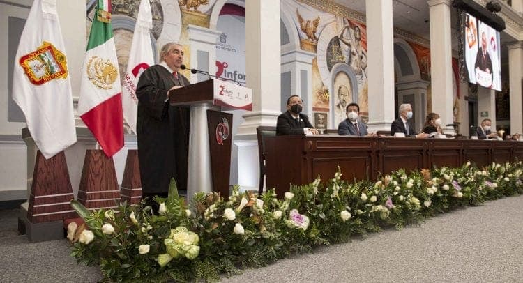 En el Palacio de Justicia de Toluca, ante el gobernador Alfredo del Mazo Maza y con el respaldo de magistrados, consejeros, jueces, personal jurisdiccional y administrativo, Sodi Cuellar destacó que pese a la pandemia el Tribunal Superior de Justicia mexiquense no paró, por el contrario, se consolidó como referencia a nivel nacional e internacional.