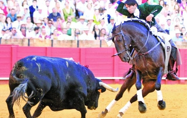 Porque recogió al toro en los medios, se lo hiló al estribo, se lo llevó por dentro y completó una magistral vuelta al ruedo a la Maestranza con el astado oliéndole la bota, no más nunca de milímetros, pulseando la embestida para que no se detuviera nunca, esperándolo en décimas de segundo para no dejar de galopar nunca de costado y llevar embebido al toro. Puso Sevilla en pie con un pasaje marca de la casa con el caballo
