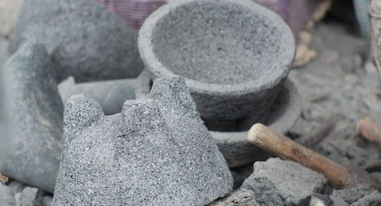 En medio de una polvareda, las manos de artesanos dan forma a utensilios prehispánicos que aún prevalecen en las cocinas mexicanas; se trata de los molcajetes que son elaborados mediante al tallado de piedra volcánica.