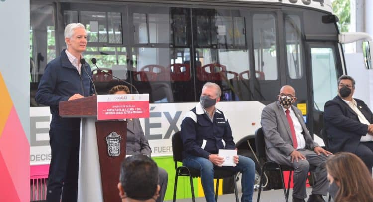 El gobernador Alfredo del Mazo Maza dio el banderazo de salida de las nuevas unidades articuladas, que renuevan la flota vehicular de la Línea 1 del Mexibús, Ciudad Azteca – Tecámac.