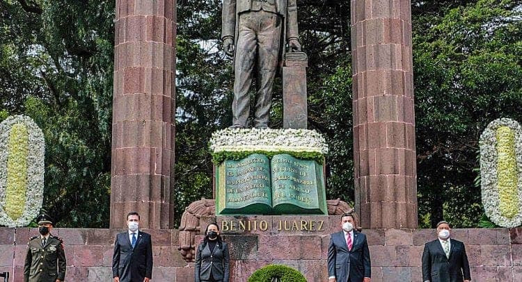 En el Hemiciclo a Juárez, en la ciudad de Toluca, Alejandra Del Moral destacó que los mexiquenses conmemoran a Benito Juárez con unidad, paz, siendo leales a México y a sus instituciones, unidos bajo los principios de liberalismo social y político, estado laico y democrático, República federal, sociedad secular con libertad de conciencia.