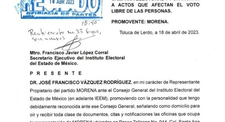 En un documento sellado de recibido por la oficialía de partes del organismo electoral, el representante propietario de MORENAante el Consejo General del IEEM, José Francisco Vázquez Rodríguez solicitó se dictaran medidas cautelares por la clara violación a las obligaciones previstas en la Ley General de Partidos Políticos; así como a las reglas de Campaña Electoral: y por incitara actos que afectan el voto libre de las personas.