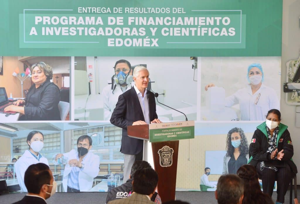 • El gobernador Alfredo del Mazo entregó apoyo económico a 105 investigadoras y científicas de 23 instituciones educativas, de las cuales 32 son de la UNAM y 31 de la UAEM