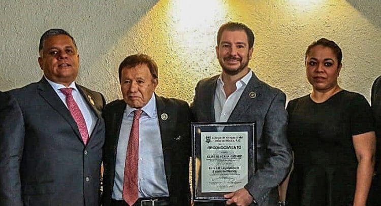 Tlalnepantla.- El Presidente del Colegio de Abogados del Valle de México, A.C., Joaquín Rodríguez Lugo, otorgó un reconocimiento al Coordinador del Grupo Parlamentario del PRI, Elías Rescala Jiménez, por su desempeño y trabajo en la LXI Legislatura.
