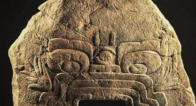 El especialista explica que las fauces abiertas de la entidad simbolizan el acceso al inframundo y agrega que “sobre su boca se proyecta una secuencia de tres bandas concéntricas, figurando el acceso cruciforme a una caverna”.