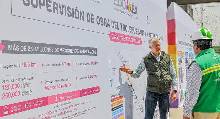 Ciudad de México.- Como parte de los trabajos que se llevan a cabo para mejorar la movilidad de las personas que viven en la Zona Metropolitana del Valle de México, se construye el Trolebús Santa Martha-Chalco, obra que fue supervisada por el Gobernador Alfredo Del Mazo, quien indicó que esta línea estará integrada por 13 estaciones y dos terminales y permitirá reducir los tiempos de traslado.