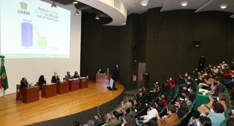 A ocho meses de la Administración 2021-2025 de la Universidad Autónoma del Estado de México (UAEM) se alcanzó la reducción de 55.3 por ciento de la deuda con el Instituto de Seguridad Social del Estado de México y Municipios (ISSEMyM) gracias a las acciones de ahorro y el adecuado manejo de los recursos acorde a las políticas de transparencia y rendición de cuentas.