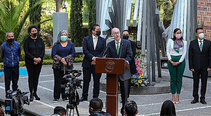 En el “Monumento a la Libertad de Expresión” ubicado en la Facultad de Ciencias Políticas y Sociales de la UAEMéx, Barrera Díaz acompañado de la directora de este organismo académico, Laura Benhumea González; del secretario de Rectoría, Marco Aurelio Cienfuegos Terrón.